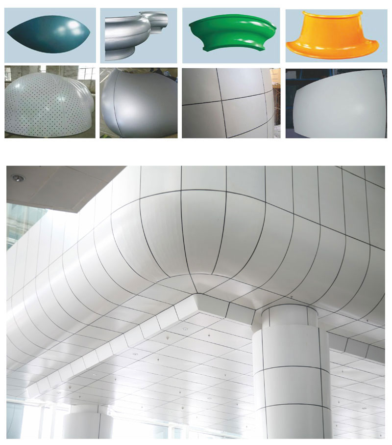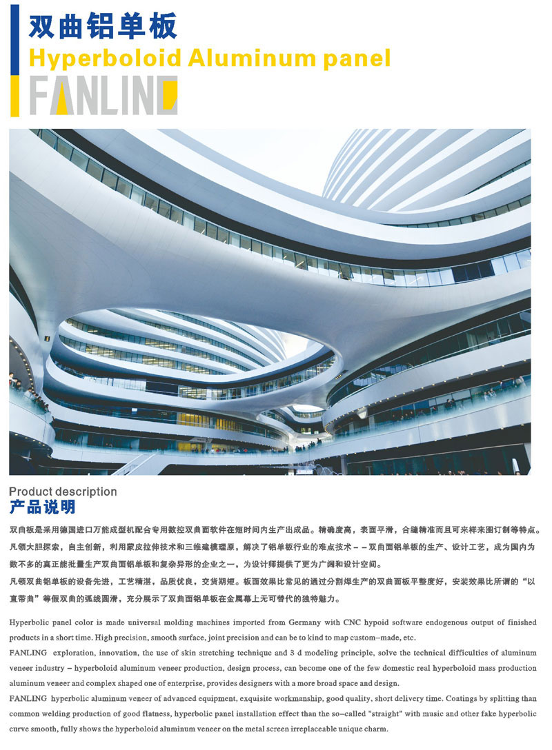 双曲铝单板:双曲板是采用德国进口万能成型机配合专用数控双曲面软件在短时间内生产出产品。精确度高,表面平滑,合缝精准,造型独特,为设计师提供了更为广阔和设计空间。