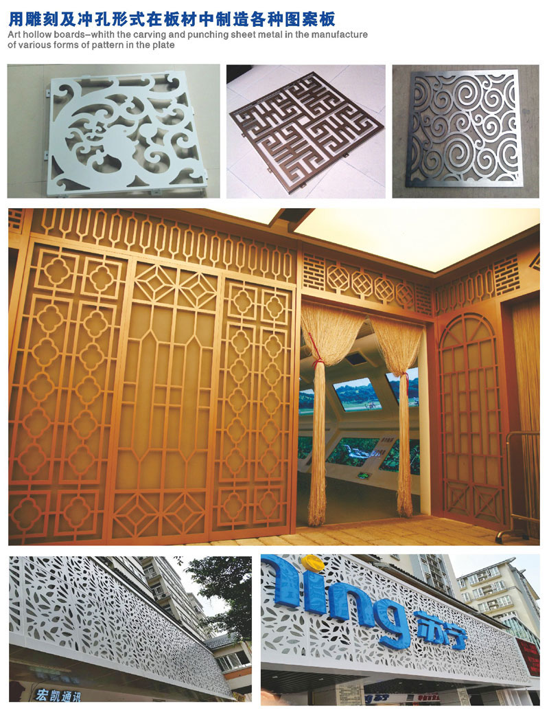 艺术雕花板:雕花铝单板凭着先进的生产技术设备,加工工艺复杂,色彩可选取性广泛,装饰效果好,环保无毒,尽显个性化,表抗静电不吸尘且容易清洗等,且安装简单。