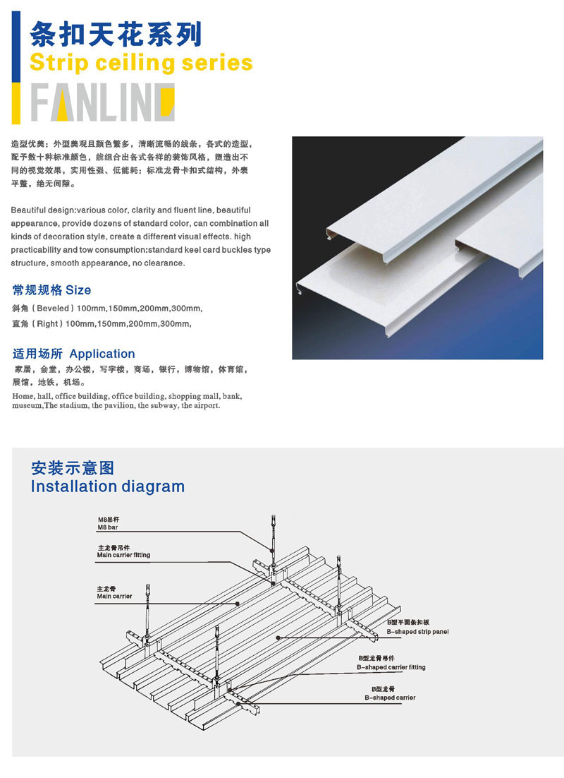 条扣天花系列:外形美观且颜色繁多,线条清晰流畅,造型独特,使用性强、底能耗,标准龙骨扣式结构,外表平整,绝无间隙。平质优良,高端典雅,具有完美的吸引效果,色彩丰富。